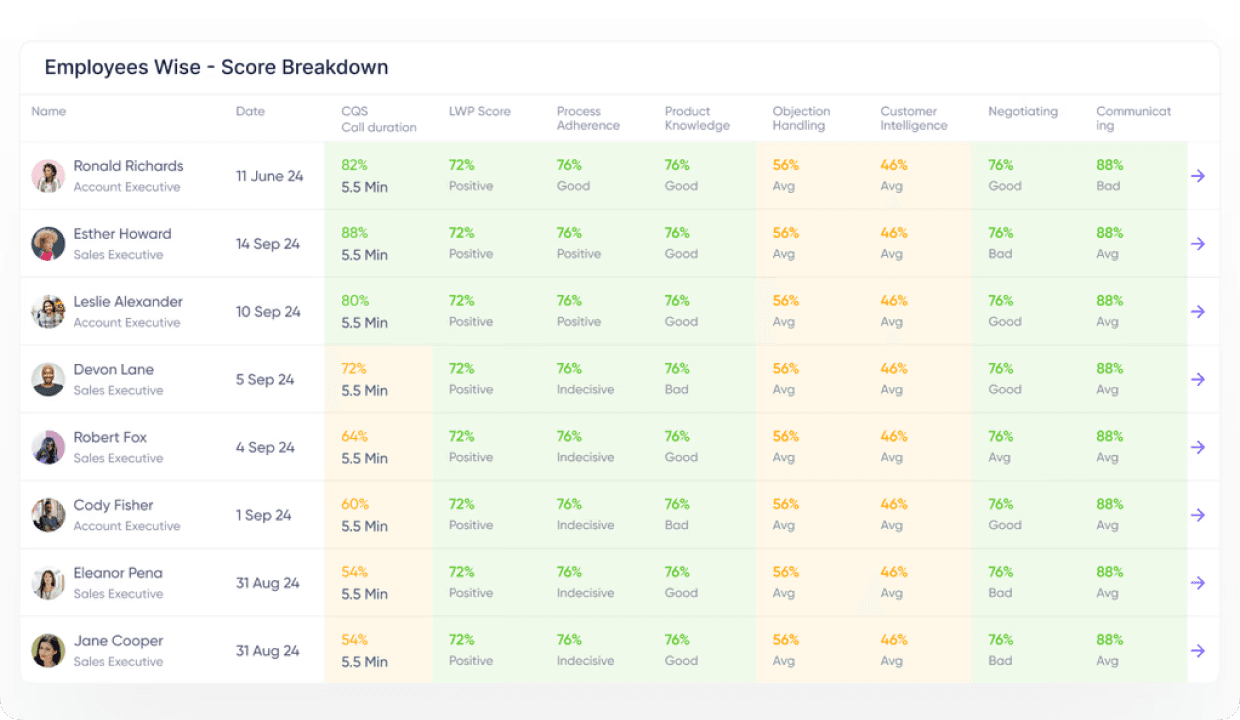 Every roleplay call is automatically analysed to show strengths, sales derailers, and field readiness at both individual reps and team levels.