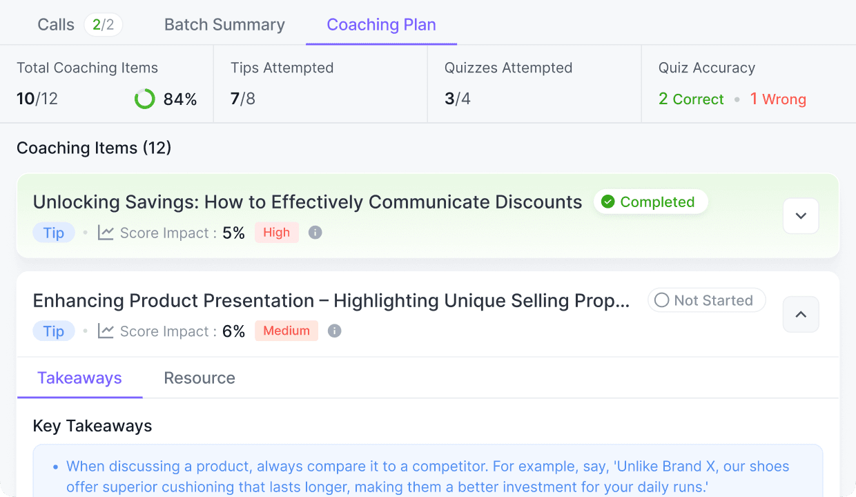Each rep gets personalised coaching plans, weekly skill practice, learning material, and clear action items based on their performance to improve week-on-week.