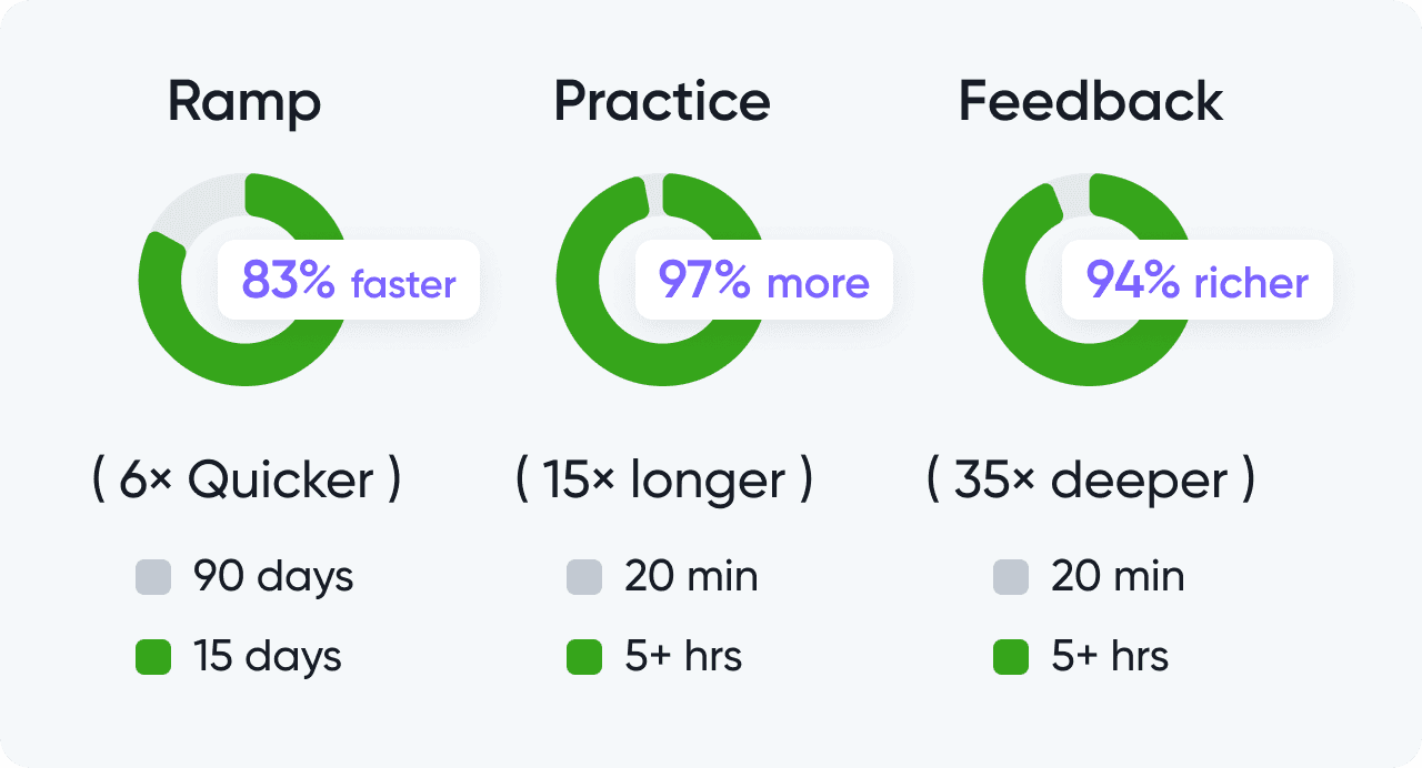By moving from manual onboarding to an AI-driven, practice-first sales readiness engine, the organization achieved: