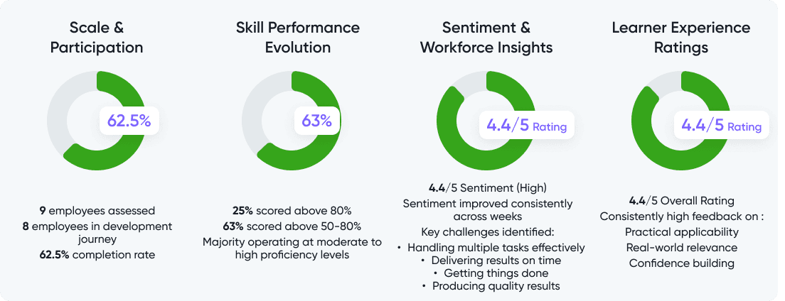 Assessment insights indicated that employees were operating across moderate to high proficiency levels, with clear improvement in core workplace capabilities such as communication, structured thinking, and execution.
