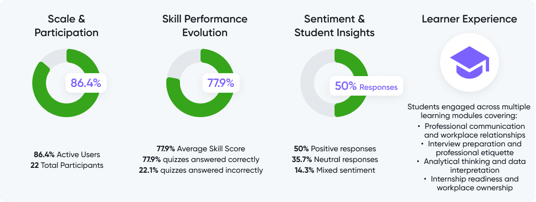 A mid-sized maritime academic institution improved workplace readiness through structured digital learning, achieving 86.4% completion, 77.9% skill scores, and 4.5/5 ratings. The program enhanced communication, analytical thinking, and career preparedness with real-time skill tracking and practical learning modules.
