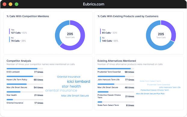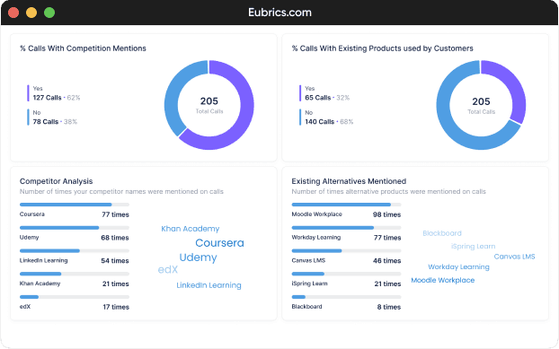 Stay ahead of the competition by understanding how often competitors are mentioned on sales calls. Our platform tracks competitor mentions and alternative product discussions, giving you clear insights into what prospects are considering. Additionally, customer intelligence data provides valuable insights into customer personas, common objections, and the features that excite them the most.