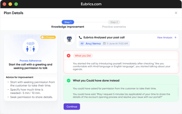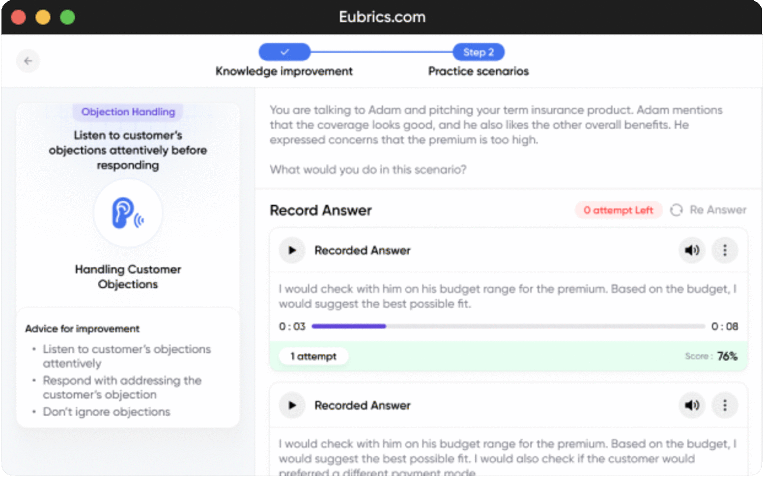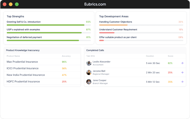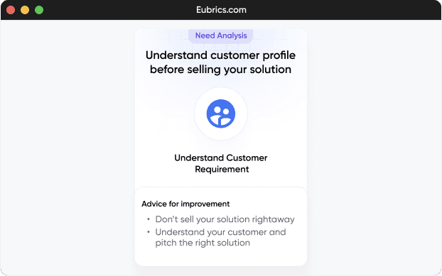 Forget generic feedback. Our platform provides personalized weekly improvement plans based on individual performance metrics. Whether it’s improving objection handling or refining product articulation, reps get clear, actionable suggestions tailored to their specific needs. These guided recommendations help sales reps continuously enhance their performance, ensuring a higher chance of lead conversion.