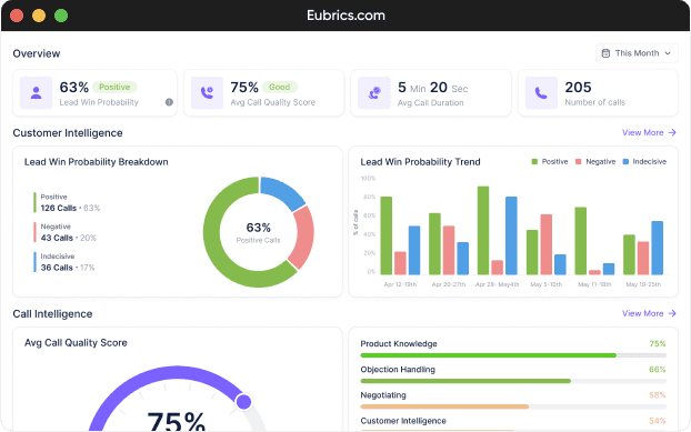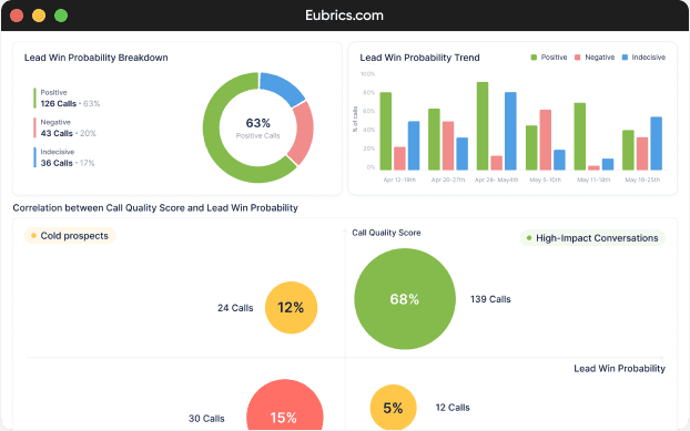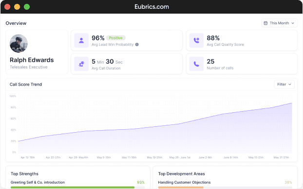 Take the guesswork out of managing your sales team. Our platform correlates call quality factors—like product knowledge and objection handling—with high lead win probability. Sales heads can easily spot trends, understand the key drivers of success, and implement strategies to improve overall team performance.